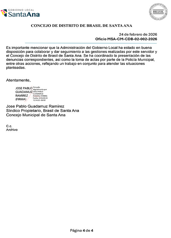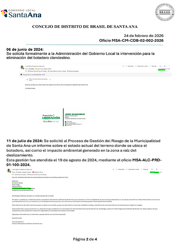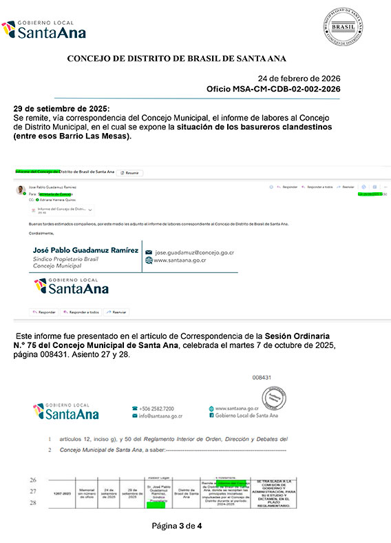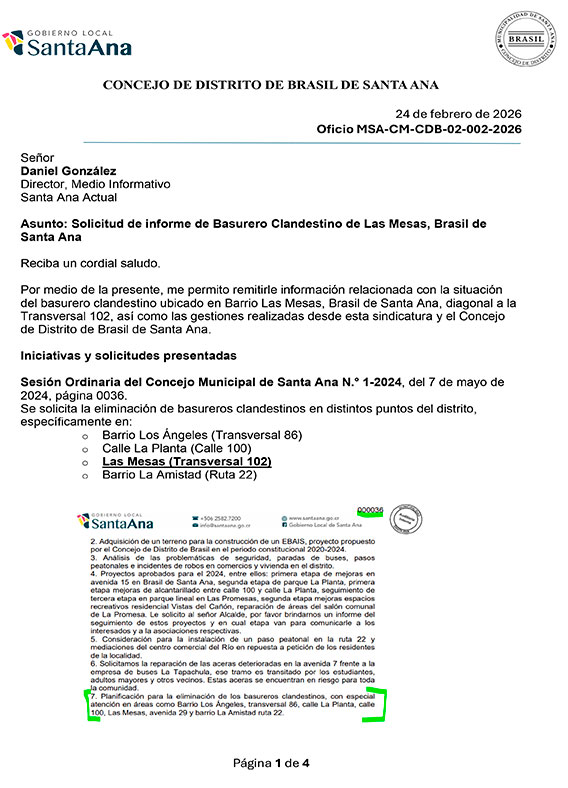 De acuerdo con la documentación remitida a este medio por el síndico del Concejo de Distrito de Brasil, el tema fue planteado formalmente en la Sesión Ordinaria N.º 1-2024 del Concejo Municipal, celebrada el 7 de mayo de 2024, donde se solicitó la eliminación de varios basureros clandestinos en el distrito, incluyendo el de: