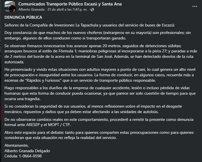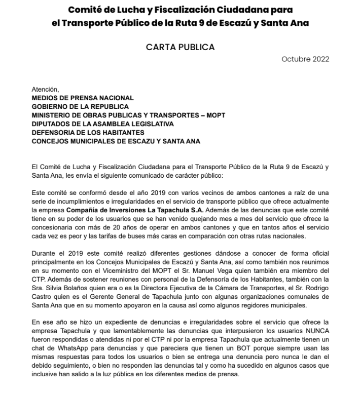 Estas denuncias coinciden con lo expuesto en una carta pública emitida en octubre del 2022 por el Comité de Lucha y Fiscalización Ciudadana para el Transporte Público de la ruta 9, donde se documentan años de inconformidades contra la empresa. El documento señala incumplimientos reiterados en la calidad del servicio, así como tarifas consideradas elevadas en comparación con otras rutas del país.