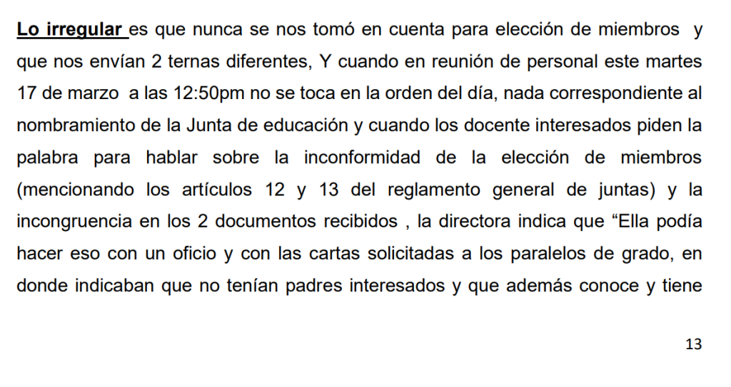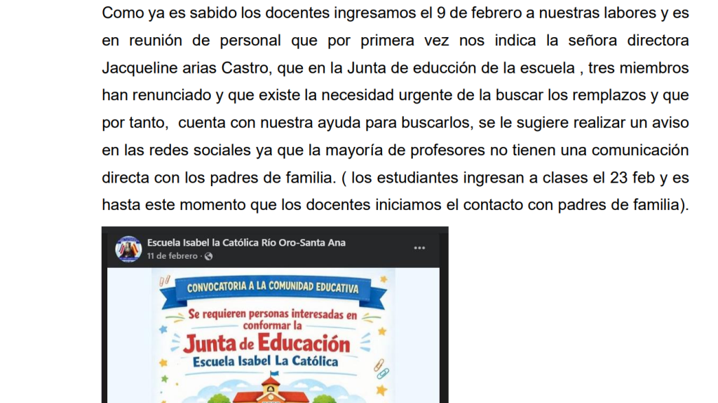 Documentos aportados por personal docente evidencian preocupación interna por el proceso. Según estos, desde inicios de febrero se informó sobre la renuncia de al menos tres miembros de la Junta de Educación, lo que obligaba a buscar reemplazos con urgencia.