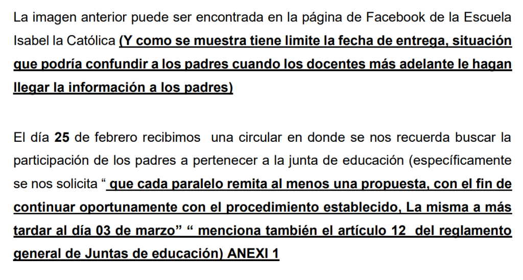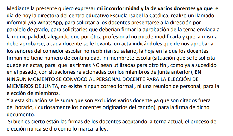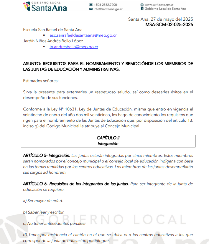 En su lugar, se habrían presentado únicamente listas con firmas, lo cual genera dudas sobre su validez administrativa. Mientras tanto un miembro de la Junta de Educación, mencionó a Santa Ana Actual, que esto se está manejando políticamente y que no quieren aceptar a los nuevos miembros por egos e influencias políticas.