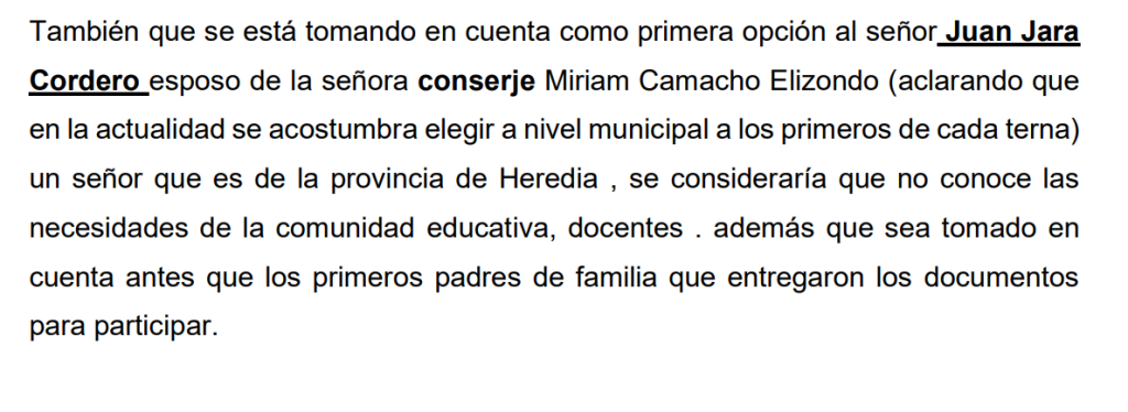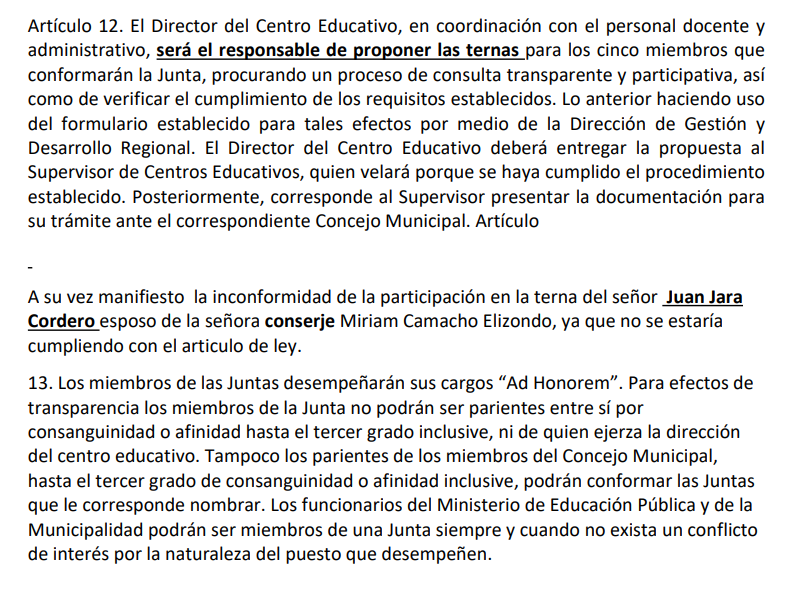 Además, se advierte sobre un posible conflicto de interés, al considerarse como opción a una persona vinculada familiarmente con personal de la institución, lo que, según el reglamento de Juntas de Educación, podría contravenir normas de transparencia.