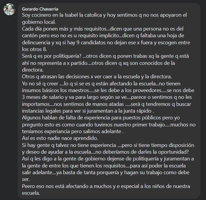 Aparentemente uno de los trabajadores del centro educativo Gerardo Chavarría, mencionó mediante un comentario en la transmisión de la sesión del Concejo Municipal, sentirse preocupado porque ya son meses que no les pagan e indica que desde el concejo no les estan apoyando y que ponen trabas por un tema político.