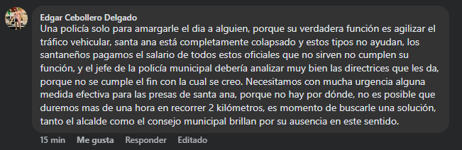 El comentario fue publicado por Delgado en la red social Facebook, en una publicación oficial de la Municipalidad de Santa Ana, donde cuestionó el enfoque de los operativos policiales en medio de la congestión vehicular que afecta a la zona. Según manifestó, la función principal de la Policía Municipal debería ser la agilización del tránsito y no acciones que, a su criterio, agravan la situación vial.