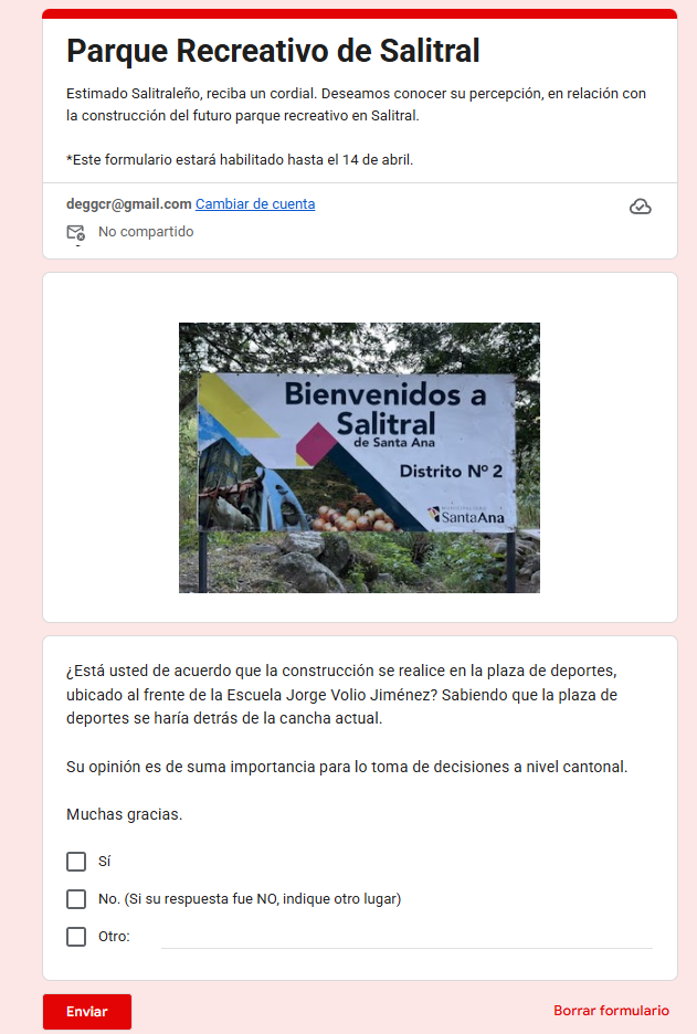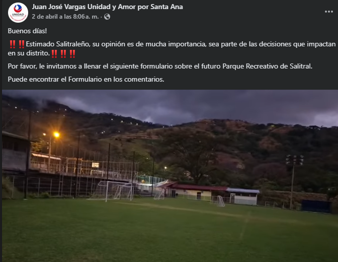 Uno de los puntos que ha generado mayor discusión es la ubicación del eventual parque. Según la encuesta promovida por los regidores del PUSC, una de las alternativas contempla el uso de la actual cancha de fútbol de Salitral.