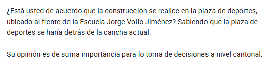 Los regidores municipales del Partido Unidad Social Cristiana (PUSC), Gonzalo Rojas y Cynthia Robles, estan promoviendo una consulta ciudadana dirigida a vecinos del distrito de Salitral, con el objetivo de conocer su opinión sobre la posible construcción de un parque recreativo en esa comunidad.