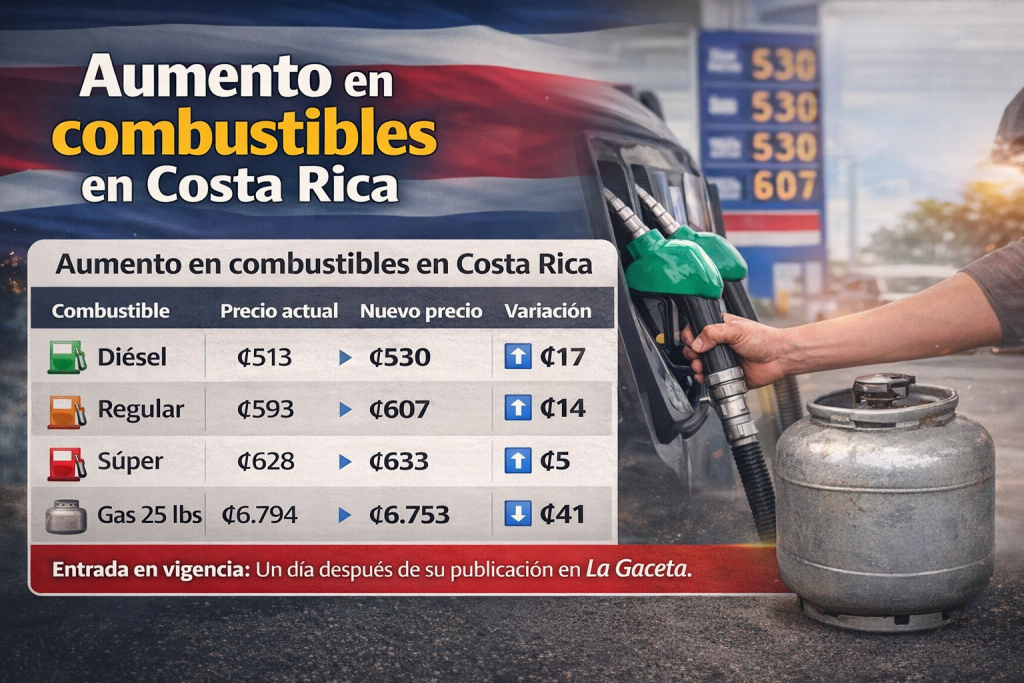 Los precios de los combustibles en Costa Rica registrarán un nuevo aumento en los próximos días luego de que la Autoridad Reguladora de los Servicios Públicos (Aresep) aprobara un ajuste tarifario que encarecerá el litro de gasolina y diésel entre ₡5 y ₡17.
