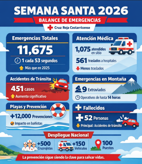 La Cruz Roja Costarricense presentó este martes el balance del operativo de Semana Santa, en el que reportó un aumento significativo en la demanda de emergencias, al tiempo que alertó sobre una delicada situación financiera que pone en riesgo la continuidad de sus servicios en el mediano plazo.