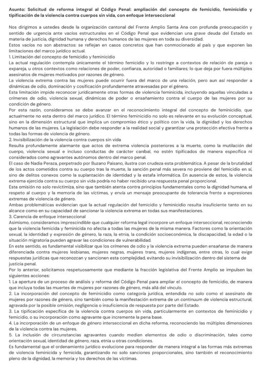 El Frente Feminista del Frente Amplio en Santa Ana presentó una solicitud formal para reformar el Código Penal costarricense, con el objetivo de ampliar el concepto de femicidio, incorporar la figura del feminicidio y tipificar nuevas formas de violencia extrema contra las mujeres.