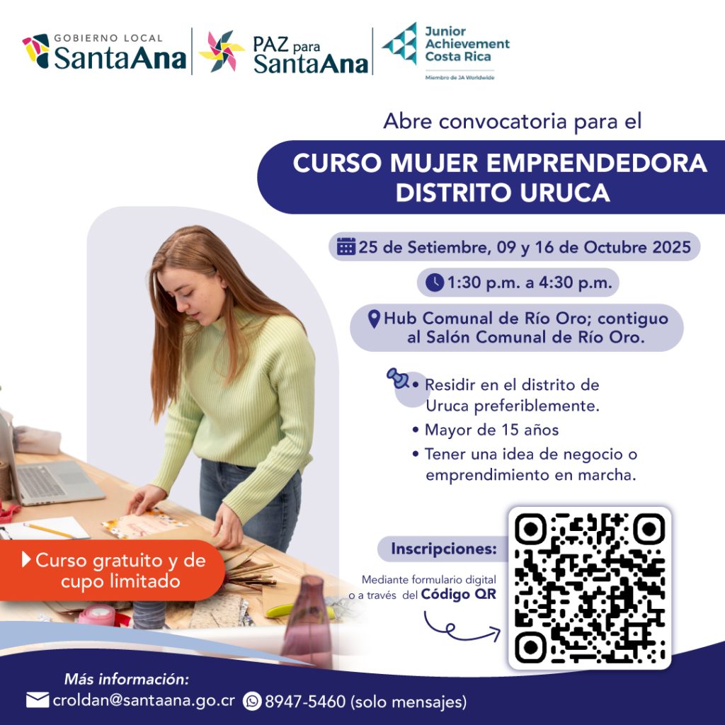 El Gobierno Local, en conjunto con la organización Junior Achievement Costa Rica, anunció la apertura de inscripciones para el Curso Mujer Emprendedora, dirigido especialmente a vecinas del distrito de Uruca.
