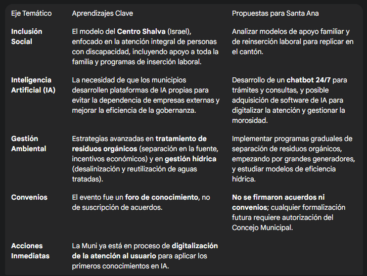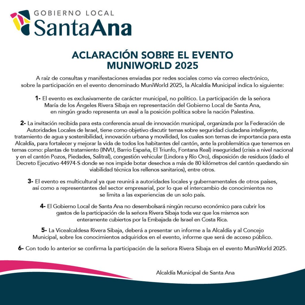La vicealcaldesa la Dra. Marielos Rivera Sibaja mencionó ayer un informe ante el Concejo Municipal sobre su participación en el evento MuniWorld 2025 en Israel. El reporte se centró en la adquisición de conocimientos técnicos y buscó aclarar la polémica generada por el viaje, reiterando que fue de carácter estrictamente municipal y administrativo, y que los gastos fueron cubiertos por la Embajada de Israel.