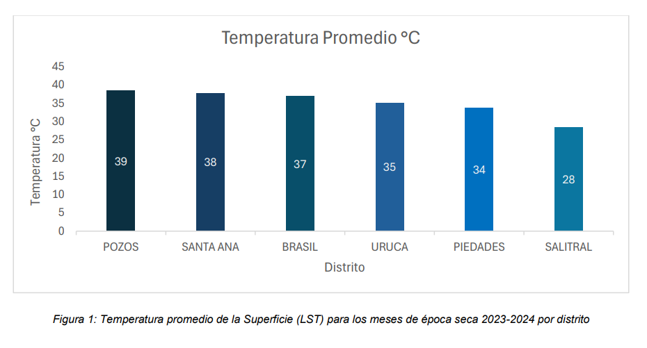 De acuerdo con los resultados, los distritos de Pozos y Santa Ana concentran las temperaturas promedio más altas, alcanzando valores cercanos a 39 °C y 38 °C, respectivamente, seguidos por Brasil (37 °C) y Uruca (35 °C). En contraste, Salitral, con mayor presencia de áreas verdes, registra temperaturas significativamente menores, alrededor de 28 °C, mostrando un efecto moderador asociado a la cobertura vegetal.