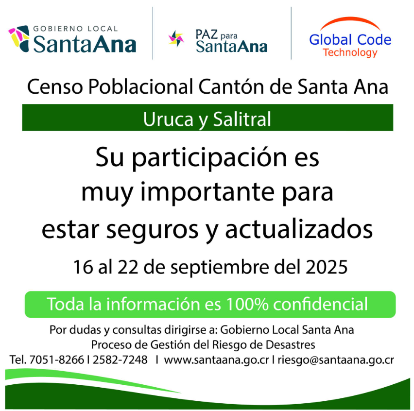 Del 16 al 22 de setiembre se llevará a cabo el censo poblacional 2025 en las comunidades de Uruca y Salitral de Santa Ana, con el objetivo de recopilar información que permita diseñar estrategias de prevención y atención ante eventuales situaciones de riesgo.