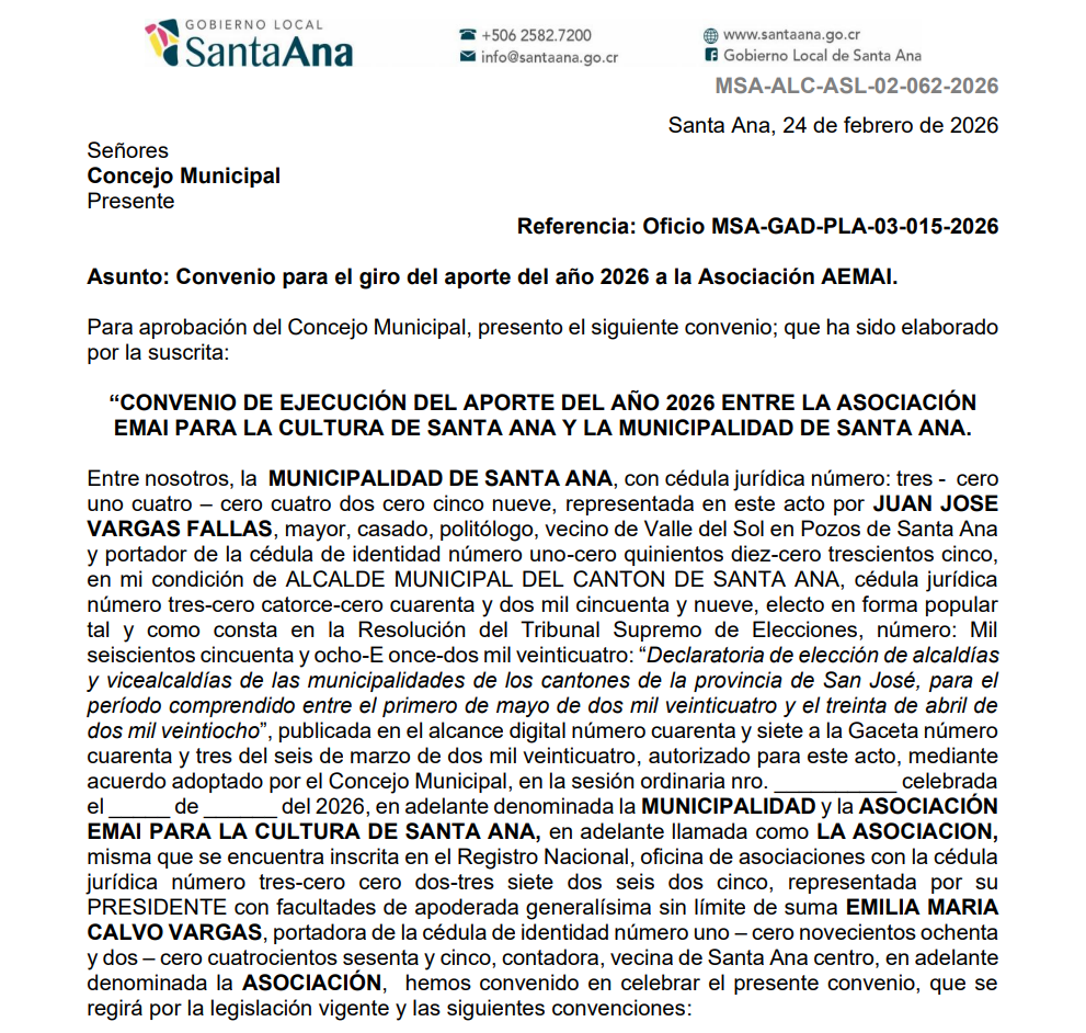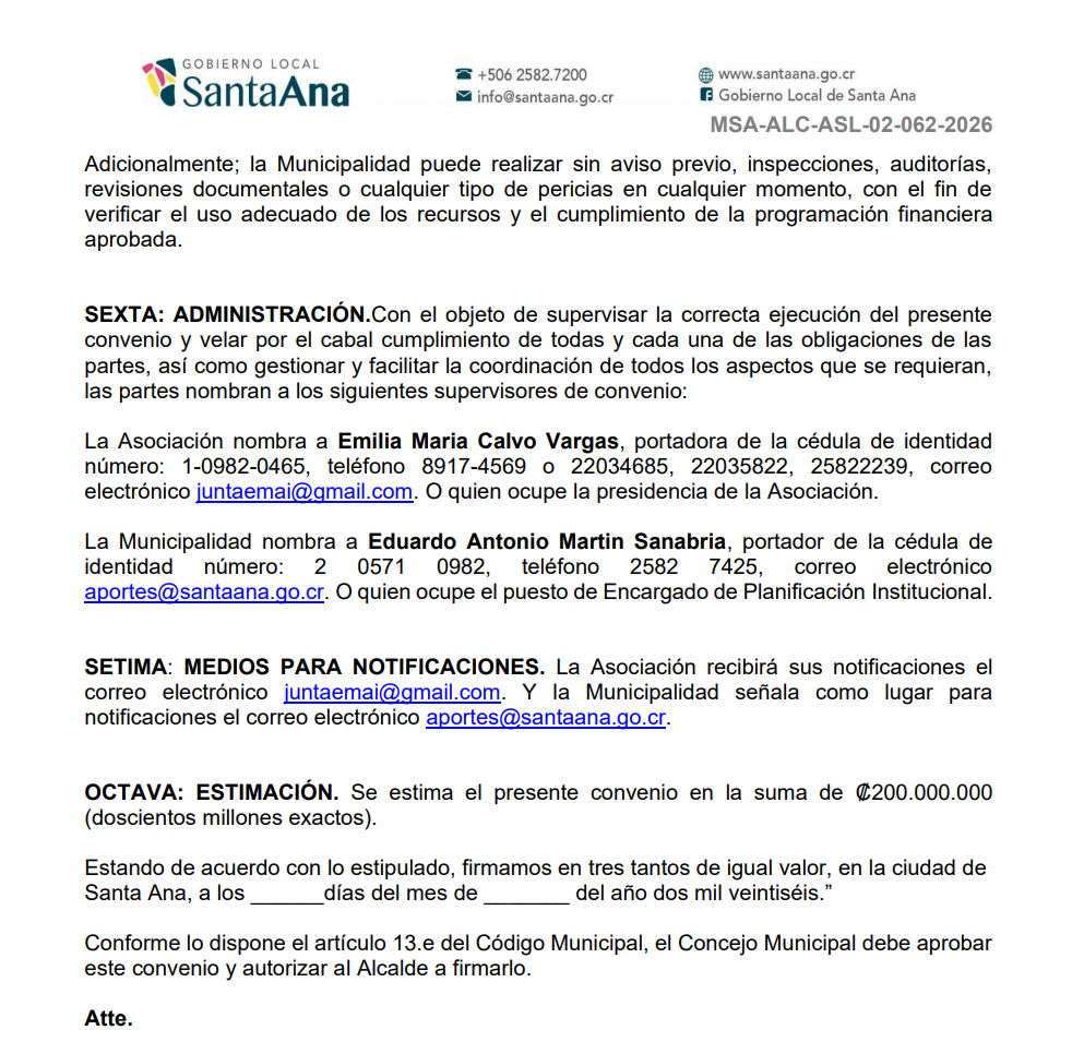 El acuerdo se tramitó bajo el oficio MSA-ALCASL-02-062-2026, fechado el 24 de febrero de 2026 y suscrito por la asesora legal municipal, Andrea Robles Álvarez, mediante el cual se solicitó la aprobación formal del convenio que permitirá realizar la transferencia de los recursos correspondientes a este año.