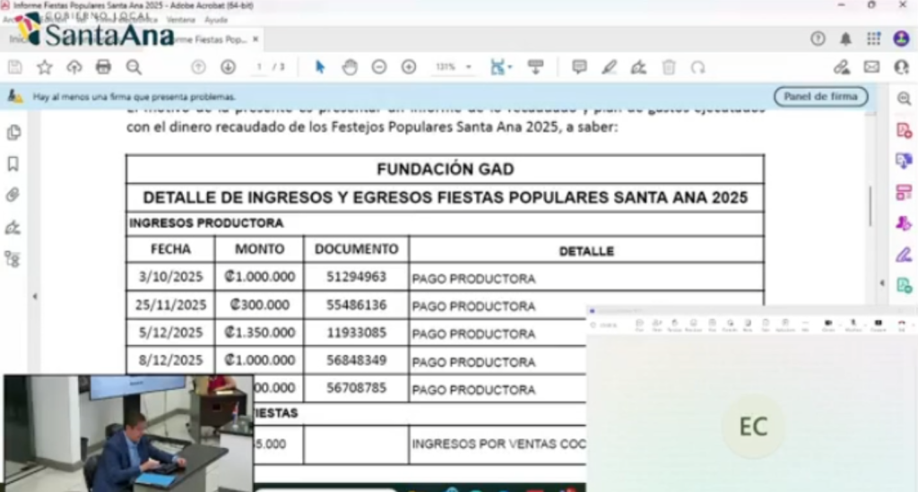 La Fundación GAD, organización que tuvo a su cargo la realización de las Fiestas Populares de Santa Ana 2025, presentó este jueves un informe de rendición de cuentas ante el Concejo Municipal, en medio de cuestionamientos por pagos pendientes de la empresa productora que organizó el evento.