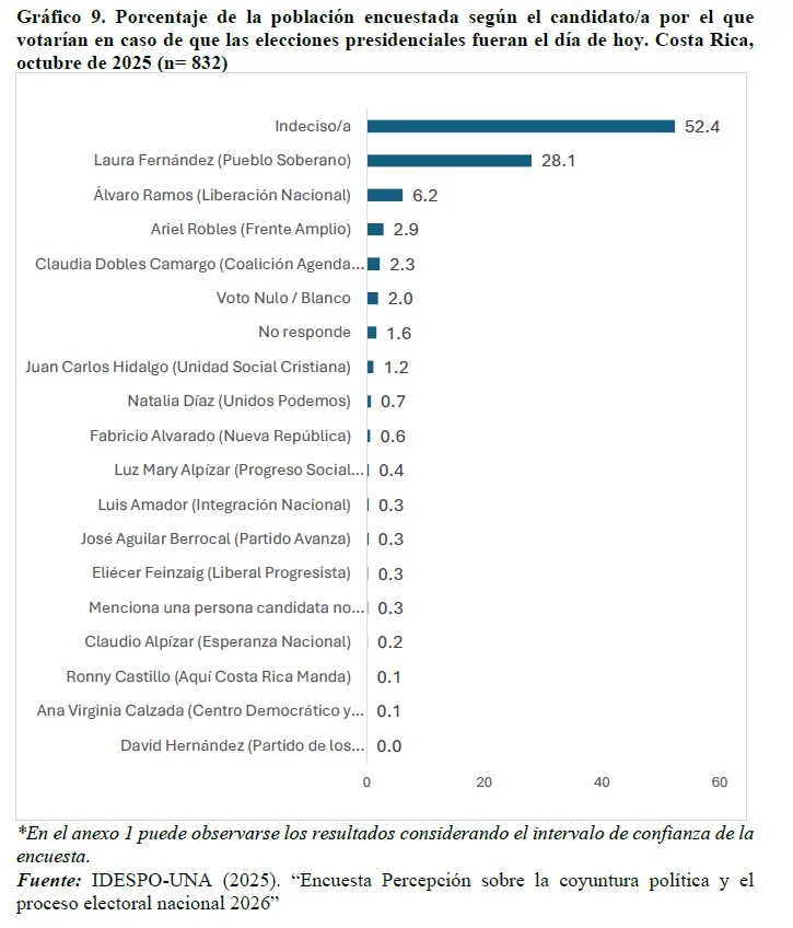 De acuerdo con el estudio, Fernández obtiene un 28,1% de apoyo, muy por encima del segundo lugar, ocupado por Álvaro Ramos de Liberación Nacional, con apenas 6,2%. En tercer puesto aparece Ariel Robles, del Frente Amplio, con 2,9%, seguido por Claudia Dobles de la Coalición Agenda Ciudadana, con 2,3%.