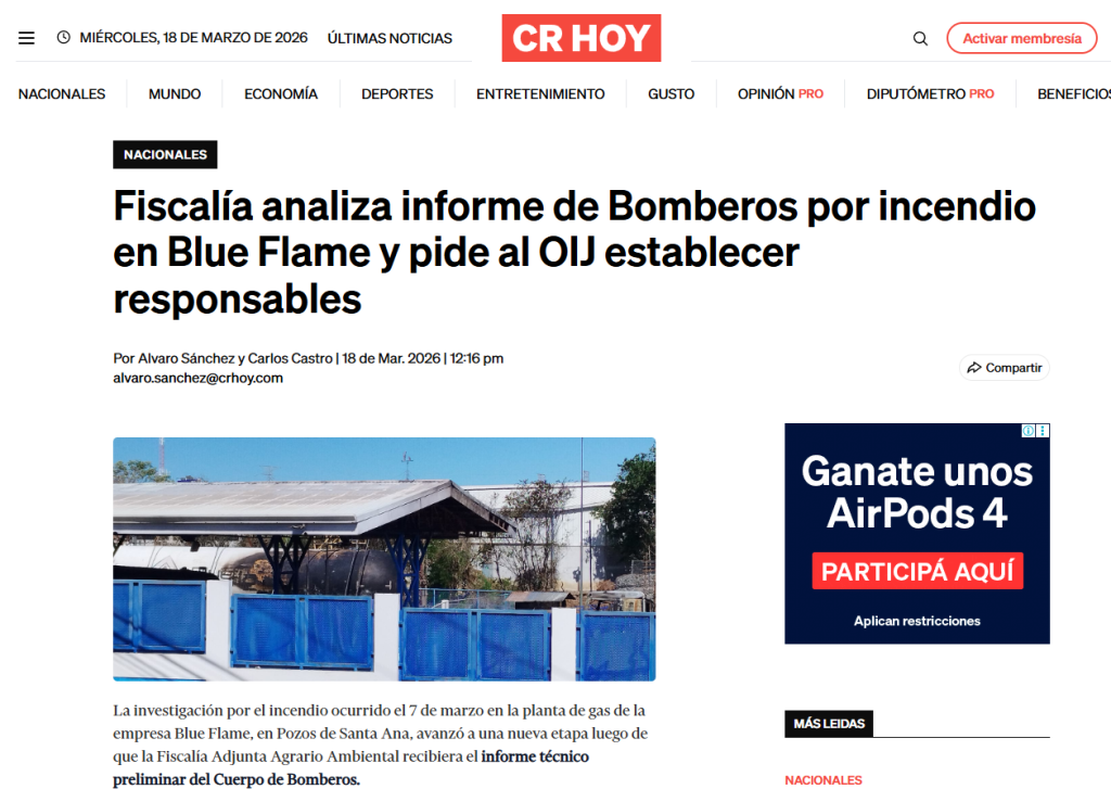 De acuerdo con la cobertura publicada por el medio digital CRHoy, el documento técnico representa un insumo clave para reconstruir lo ocurrido durante la emergencia, que generó alta preocupación debido a la naturaleza de la actividad de la empresa, dedicada a la comercialización de gas.