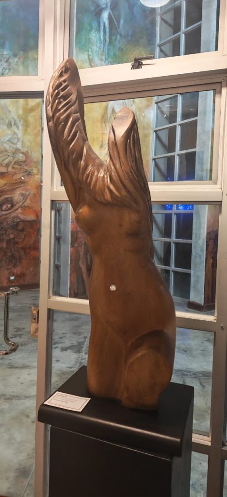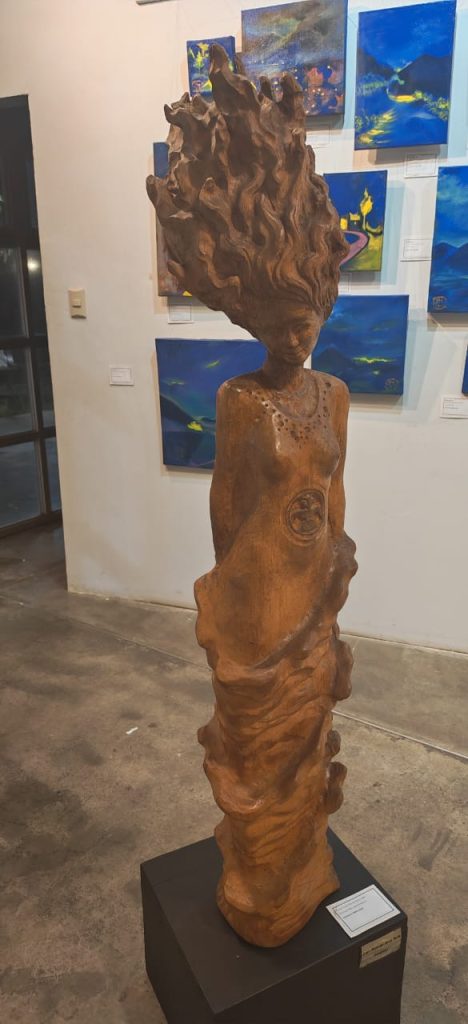 Además de las pinturas, la exposición incorpora una serie de esculturas titulada “Madera Humana”, elaboradas a partir de maderas tropicales recuperadas. Para Juan Manuel, cada obra pertenece a un proceso conceptual que se desarrolla en etapas o series. Una de las esculturas expuestas fue creada en aproximadamente una semana y media, una vez definido el dibujo y la proyección conceptual.