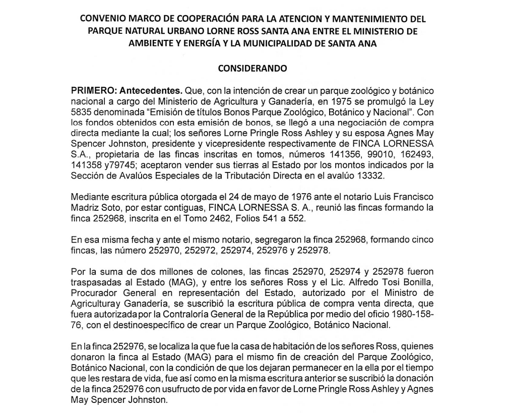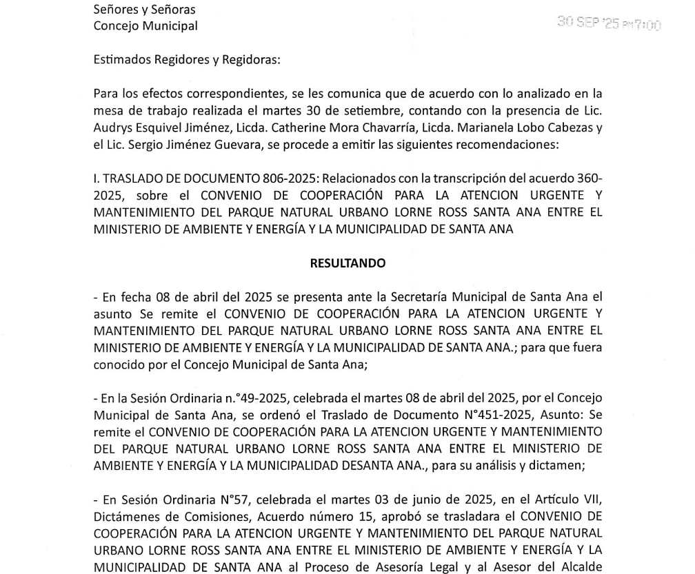 En la sesión ordinaria del Concejo Municipal celebrada este martes 28 de octubre, los regidores aprobaron de forma unánime el dictamen número 40 de la Comisión de Asuntos Jurídicos, que respalda el convenio de cooperación entre el Ministerio de Ambiente y Energía (MINAE) y la Municipalidad de Santa Ana para la administración, mantenimiento y seguridad del Parque Natural Urbano Lorne Ross.